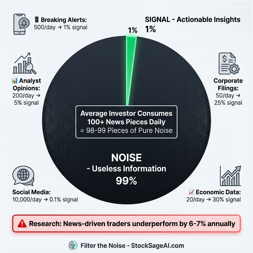 Research from Bloomberg Intelligence shows that 99% of financial news is noise—information that creates no actionable trading opportunity or long-term value insight. Yet the average retail investor spends 10-15 hours weekly consuming this noise while missing the 1% of true signals.